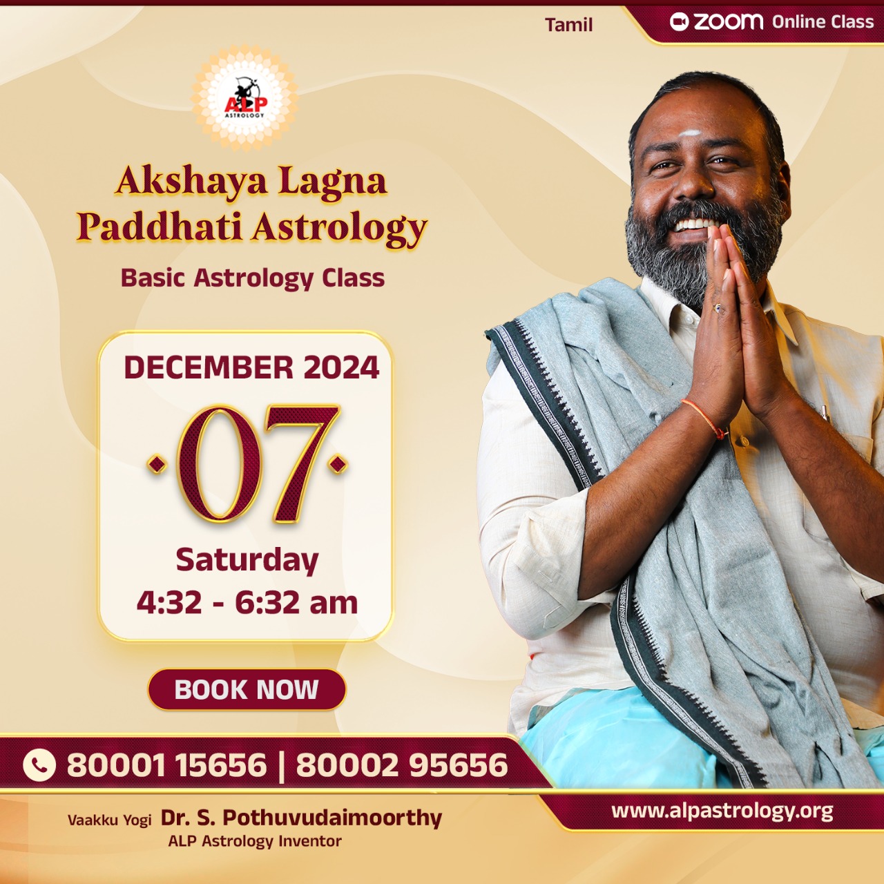 Akshaya Lagna Paddathi Astrology Basic Astrology Training Class, Daily Morning (04.32 - 06.32) 15 Days Class Astrology, Dr.S.Podhuvudaimoorthy D.T.Ed., M.A., B.Ed., M.A(Astrology).,Ph.D., Inventor of Akshaya Lagna Paddhati Astrology 7th - December- 2024 Online Class Start For Booking Contact No. 8000115656